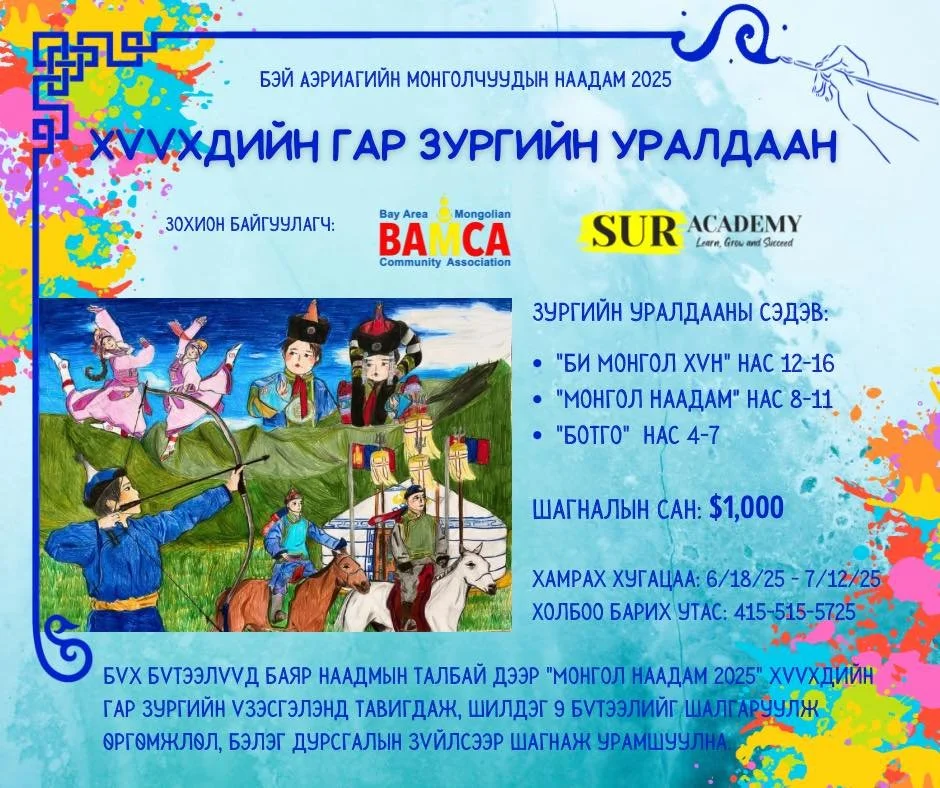 2025 оны Үндэсний Их Баяр Наадмыг тохиолдуулан Бэй Аэриад амьдран суудаг хүүхэд багачуудаа Монгол өв соёлоо танин мэдэж, дүрслэх чадвар уран сэтгэмжээ хөгжүүлэх гар зургийн уралдаанд урьж байна.